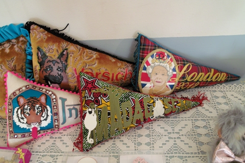 その世界各地のペナント風クッション。