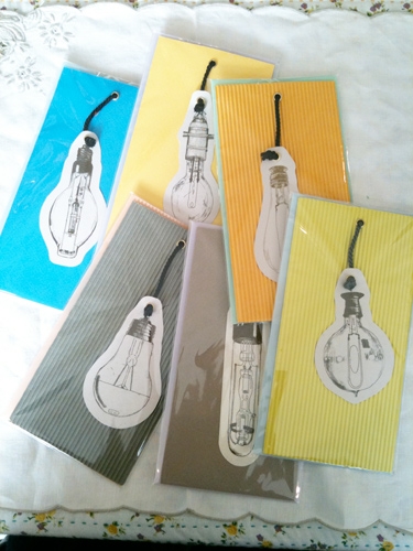 これは電球の部分を銅版画で刷って、カラフルな台紙とあわせて